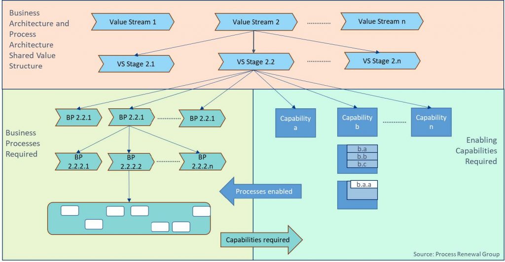 业务架构价值流和相关能力提供了一种基于价值的视角,以运营任何类型的业务(如任何酒店)所需的能力,而不考虑组织结构、位置、产品变体、特定过程,或其他区分特定业务或业务链的运营特征。相比之下,基于价值的业务流程及其作为活动和流的分解,提供了一个基于价值的视角,通过一个(可能是通用的)业务活动实现商品、信息和成果的实现。